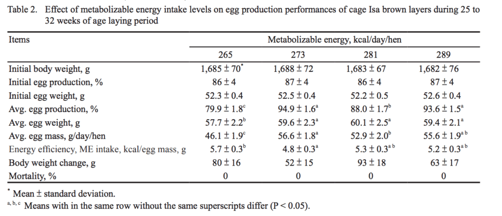 林及徐(1997年)指出,每日代謝能攝取量介於240至290千卡之間時,對種母土雞的產蛋率和產蛋飼料利用效率沒有顯著影響,但蛋重和體增重隨著代謝能攝取量的增加而增加。Pearson和Herron(1982年)也指出,肉種雞每日的代謝能攝取量介於270至385千卡之間,蛋重隨著每日能量攝取量的增加而呈線性增加。其他研究報告也顯示,能量攝取量在未滿足母雞產蛋所需範圍內時,產蛋率會隨著能量攝取量的增加而提高。