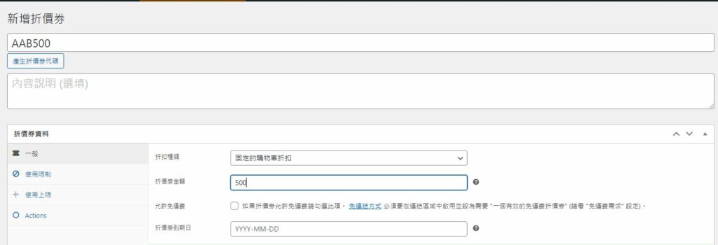 1. 首先我們需要先新增一張 500元的折價券, 折扣種類設定為”固定的購物車折扣”