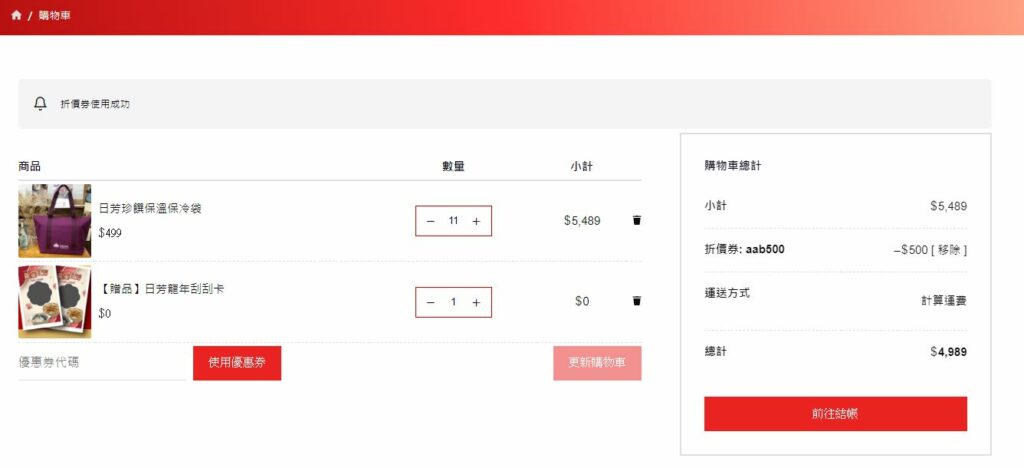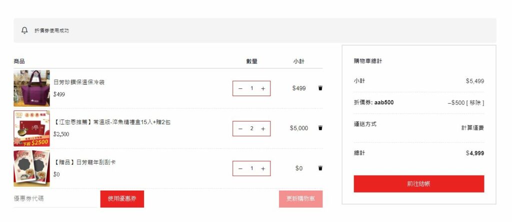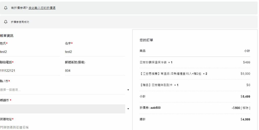 6. 接著我們讓標的種類產品達標到 5000元, 並輸入折價券碼! 很好! 看起來是有成功執行折扣!