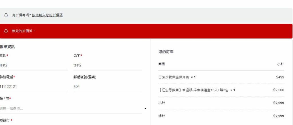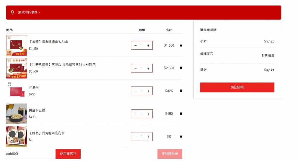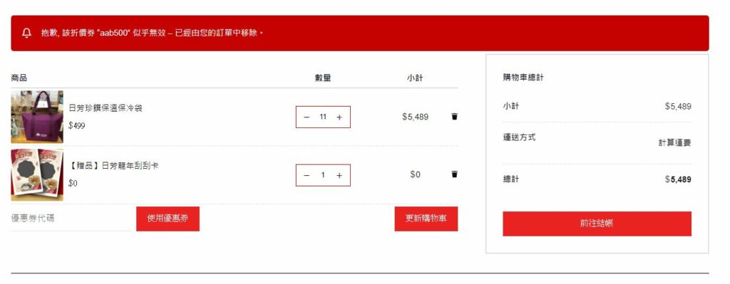 5. 現在測試購買有”淬”字的商品! 來看看是否可以達到我要程式碼執行的效果! 先將標的種類商品及其他商品, 添加到 5000元! 加入折價券碼, 很好顯示無效折價券, 看起來程式碼沒有被我騙到!